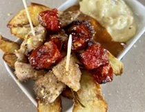 | Mini Patata Espiral con Romesco | Huevos fritos con frit Mallorquí | Patatas Bravas QK-Style |