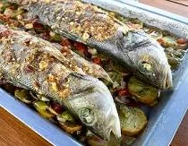 | Lubina al Horno | Marmitako de Bacoreta y Gambas | Rogent a la Brasa |